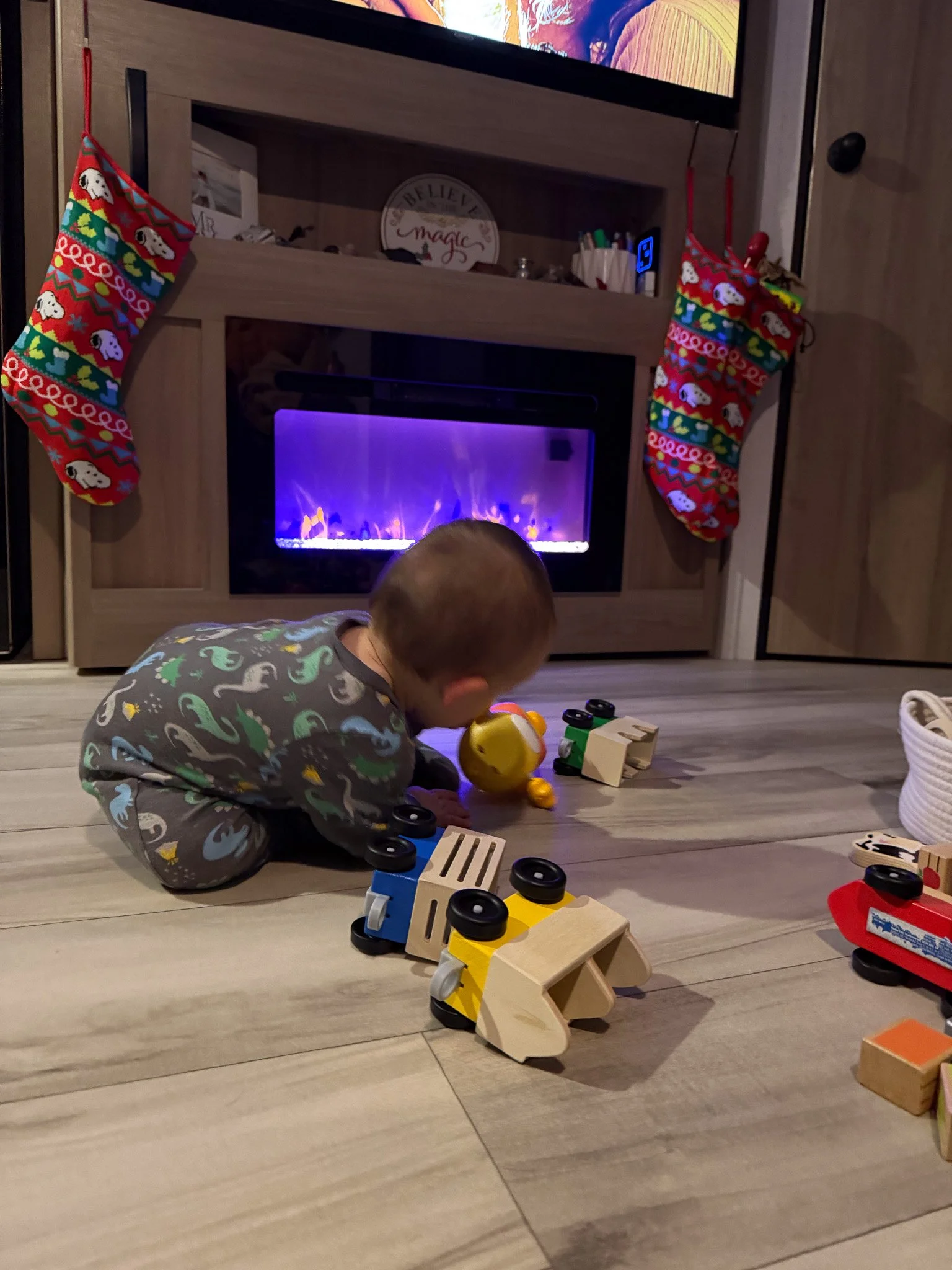 Slow mornings and scattered toys, warmed by the glow of our fireplace — life unfolding gently inside our small, moving home.